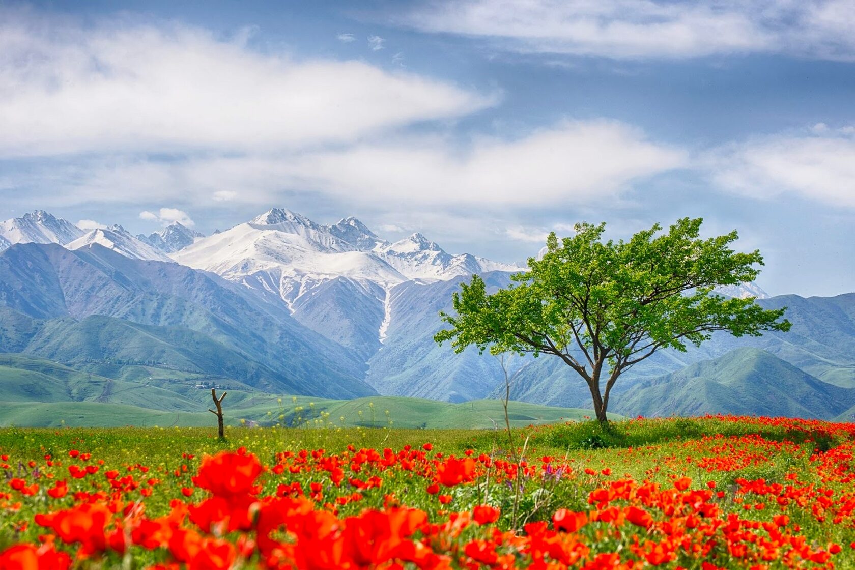 Весенние пейзажи Кыргызстана особенно красивы: зелёные долины, цветущие сады и снежные вершины создают невероятные природные картины.